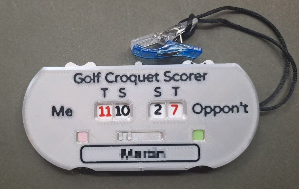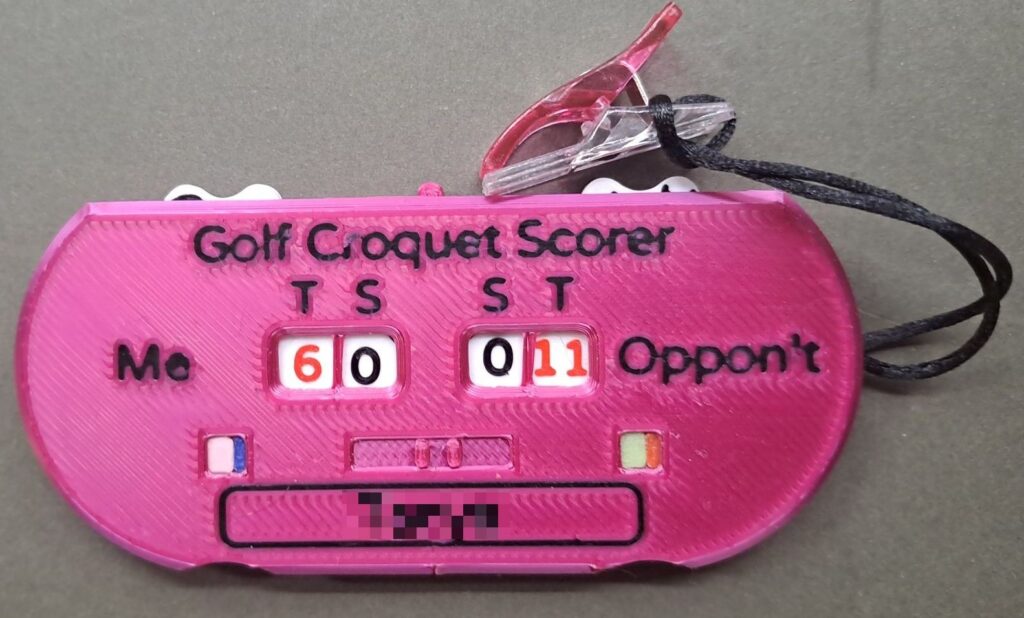 In additions, The target score system required the plyer to remember their and their opponents Target Score in order to have any idea of how well they are doing during the game. Brookwood Croquet has therefore developed a more sophisticated counter which displays the Target score(in red) as well as the current score(in black). To set the target scores at the start of the game, a button in the centre of the top edge is depressed and the numbers are changed by rotating a cog wheel at the bottom. The red number run from 5 to 13.